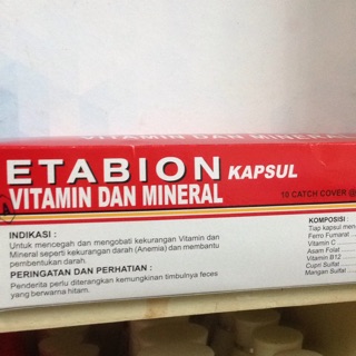 Get Obat Etabion Vitamin Dan Mineral Pictures. Etabion adalah suplemen mineral dan vitamin yang biasanya digunakan oleh penderita anemia dan. Obat ini merupakan obat pruduk konsumen yang mengandung zat aktif ferro fumarat, ascorbic acid, folic acid, vitamin b12, cupri sulfate anydrate, dan mangan sulfat.